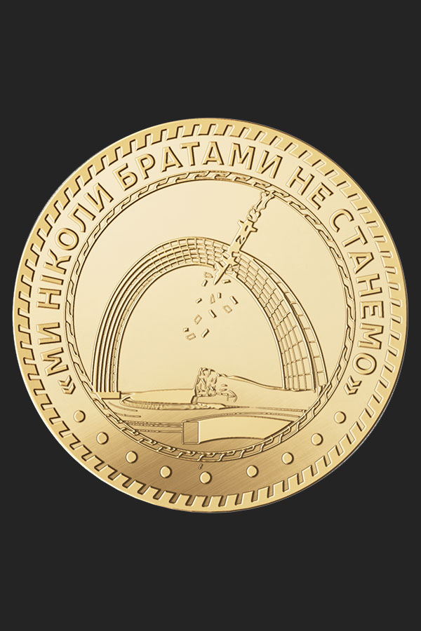 Великий радянський наратив про «братні народи»,мабуть, остаточно розвінчано. На аверсі – арка, в яку влучає російська ракета. На реверсі – рука зі Сходу і напис «І ніколи братами не були», що можуть підтвердити українці 1-ої половини ХХ століття.