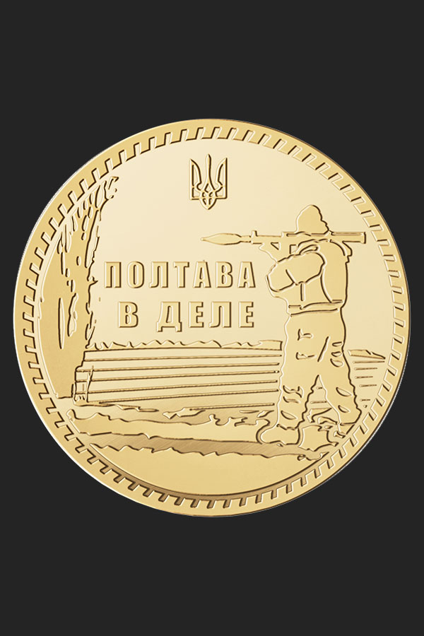 На аверсі зображений фрагмент яскравого відео в перші дні війни, коли чолов‘яга говорить «Полтава ... в деле» та стріляє з гранатомета по техніці окупанта.